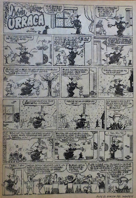 Lógicamente la censura hizo que Miguel Bernet Toledano que firmaba como Jorge rebajase esta mala leche y la convirtió en un personaje que usaba la picaresca en su beneficio. No obstante en épocas navideñas Jorge dulcificaba un poco a Doña Urraca y lo más mejor, hacia que apareciesen otros personajes. Esta página es del año 1961.